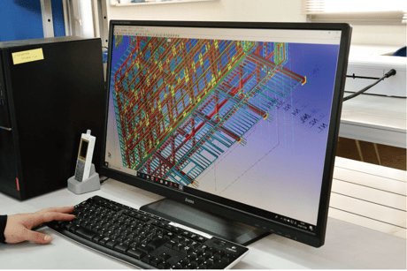 お客様より頂いた設計図から一般図(施工図)及び質疑書を作成。図面は鉄骨専用CADと汎用CAD両方を用いて作図し打ち合わせが始まります。質疑打ち合わせにより不明点を解消し柱・梁など部位毎の工作図作成に移行し現寸担当者が工程に合わせ資材発注を行います。