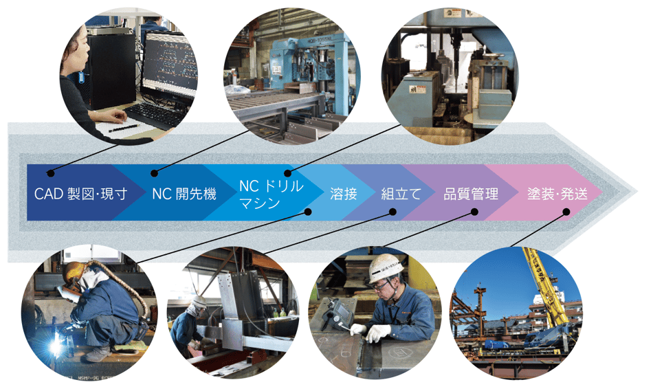 形鋼などは現寸担当者の作成した加工図や図面・資料をもとにNCドリルマシン・NC切断機・NC開先機を使って工作(一次加工)します。機械加工出来ない切断・開先は切断用ガスを使って手動で加工をします。ボルト接合箇所や強固な塗装が必要な箇所はショットブラスト処理を行います。