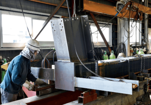 現寸手配された鋼板・鋼材・部品を定盤や架台の上で組み立てます。